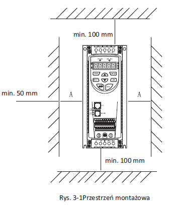 • W związku z nagrzewaniem się falownika w czasie pracy należy zapewnić odpowiednią cyrkulację powietrza wokół falownika, należy zachować odległości montażowe pokazane na poniższym rysunku:
